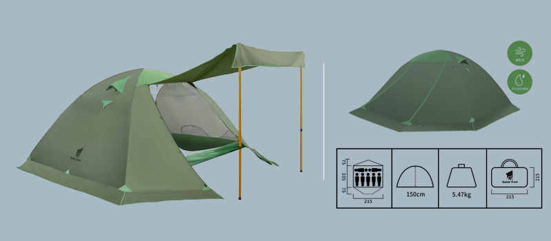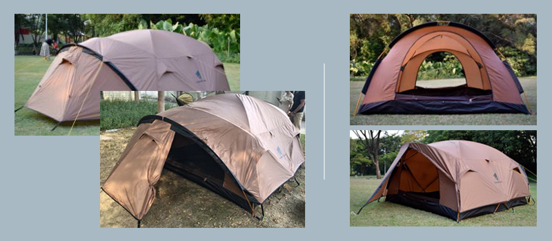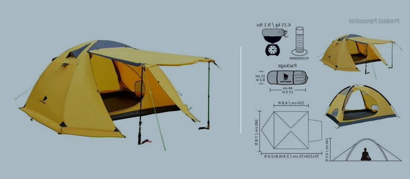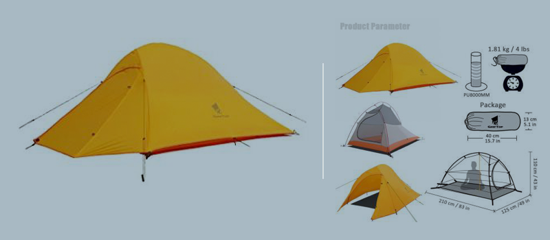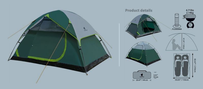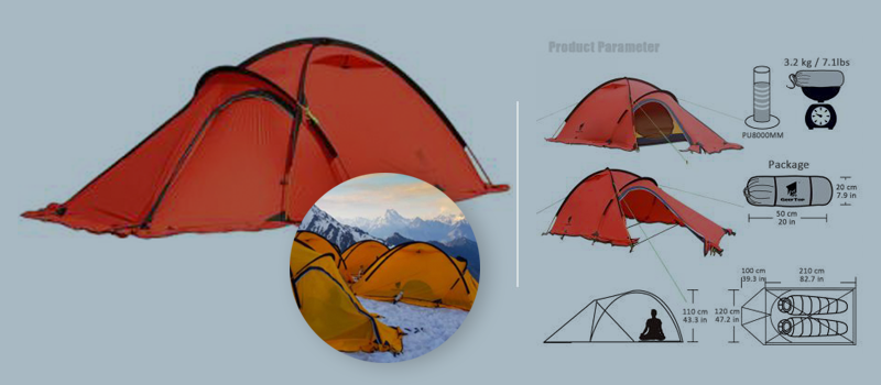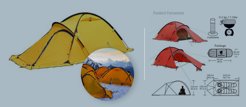 Fabric: 1. Flysheet: 20D PU8000MM waterproof silicon coated squares nylon, seam taped. 2. Inner tent: 210T breathable polyester + high-density fine nylon mesh. 3. Floor: 210T PU5000MM waterproof coating polyester, seam taped. 4. Pole Material: Aluminum, 8.5mm Specifications: 1. Seasons: 4 2. Number of doors: 2 3. Windows of flysheet: 2 4. Number of vestibular: 1 5. Sleeping capacity: 2 people