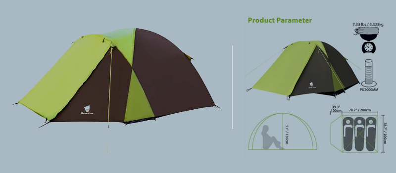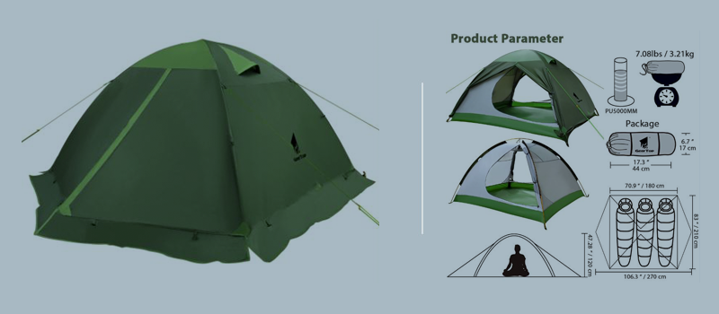 1.Inner tent material: 210T breathable polyester + high density fine nylon mesh. 2.Floor material: 210D PU5000MM Oxford fabric + seam taped. 3.Fly material: 210T PU3000MM anti-tear checkered polyester with seam taped. 4.Seasons: 4 5.Sleeping capacity: 3 6.Number of poles: 2 7.Number of doors : 2 8.Number of vestibules: 2 9.Windows of fly: 2 10.Poles material: Aluminum 11.Stakes material: Aluminum