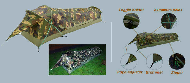 1. Flysheet: 20D PU3000MM waterproof silicon coated squares nylon, seam taped, double stitching, UV protection. 2. Inner tent: 210T polyester + high density fine mesh, double stitching. Floor 3. 55D PU5000MM Silicon Coating Nylon. 4. Seasons: 3 5. Number of doors: 2 6. Sleeping capacity: 1 7. Windows of fly: 2 8. Floor dimensions: 83