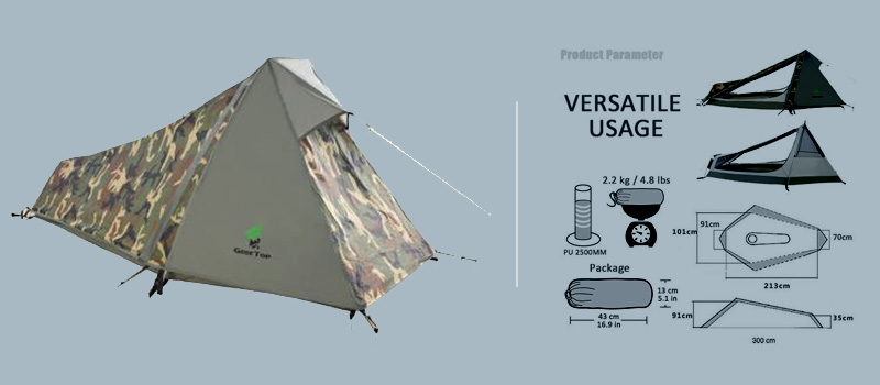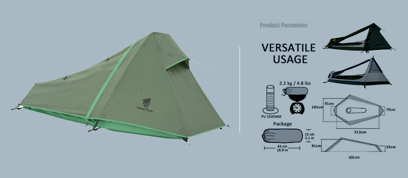 1. Flysheet: 20D PU3000MM waterproof silicon coated squares nylon, seam taped, double stitching, UV protection. 2. Inner tent: 210T polyester + high density fine mesh, double stitching. Floor 3. 55D PU5000MM Silicon Coating Nylon. 4. Seasons: 3 5. Number of doors: 2 6. Sleeping capacity: 1 7. Windows of fly: 2 8. Floor dimensions: 83