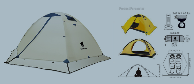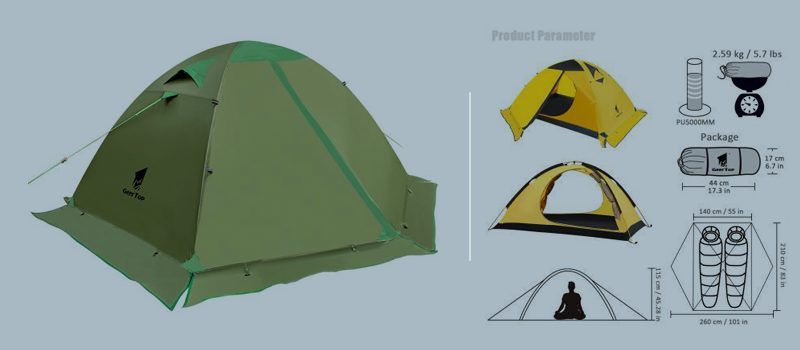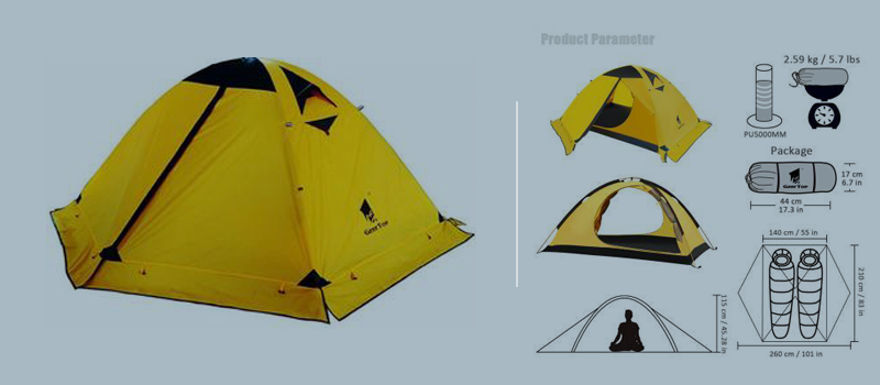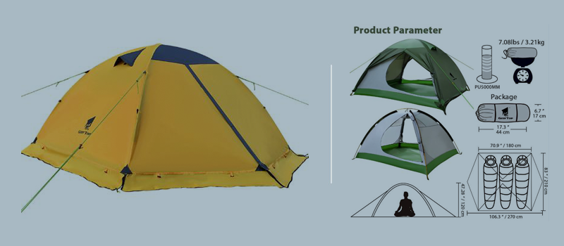 Fabric: 1. Flysheet: 20D PU8000MM waterproof silicon coated squares nylon, seam taped. 2. Inner tent: 210T breathable polyester + high-density fine nylon mesh. 3. Floor: 210T PU5000MM waterproof coating polyester, seam taped. 4. Pole Material: Aluminum, 8.5mm Specifications: 1. Seasons: 4 2. Number of doors: 2 3. Windows of flysheet: 2 4. Number of vestibular: 1 5. Sleeping capacity: 2 people