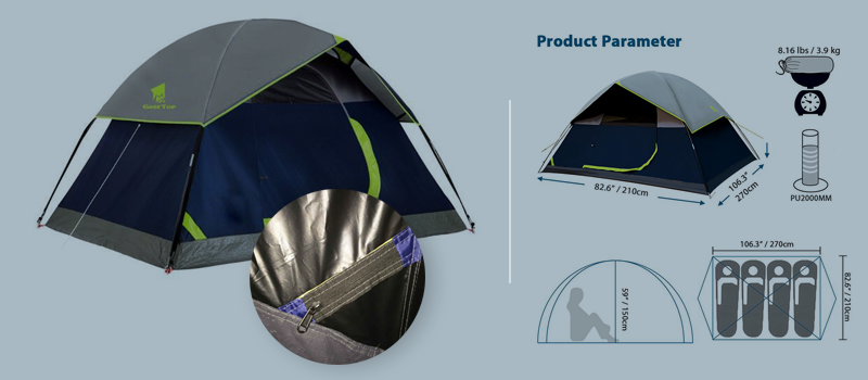 1. Flysheet: 210T PU5000MM Polyester 2. Floor: 240T PU10000MM Polyester, seam taped, double stitching. 3. Pole material: Aluminum, 8.5mm. 4. Seasons: 3
